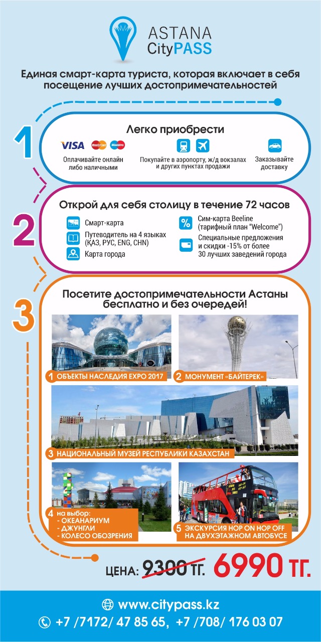 Более подробную информацию Вы сможете получить по телефону: 8(7172) 47-85-65 или на сайте www.citypass.kz