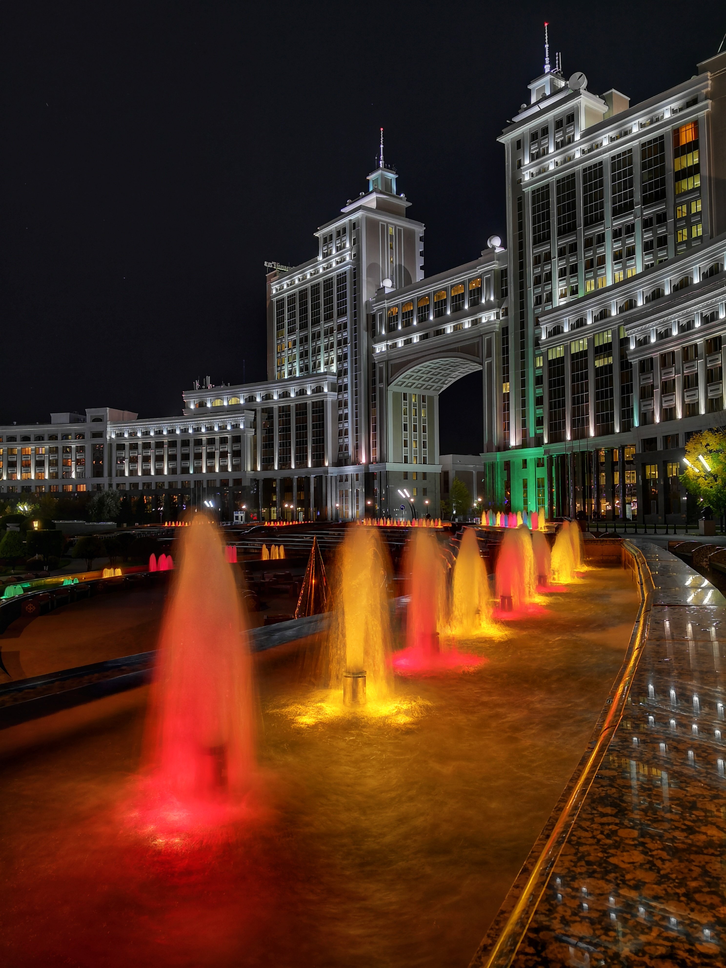 Хан-Шатыр – футуристический торгово-развлекательный центр, который в темное время суток выглядит особенно завораживающе, с подсвеченным шатром, сияющим на фоне ночного неба.